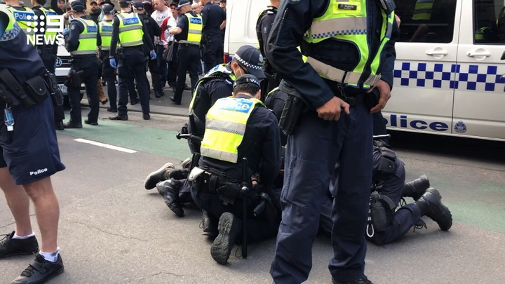 Footage from the scene shows on man punching a police officer while he was leading a woman into a patrol car.
