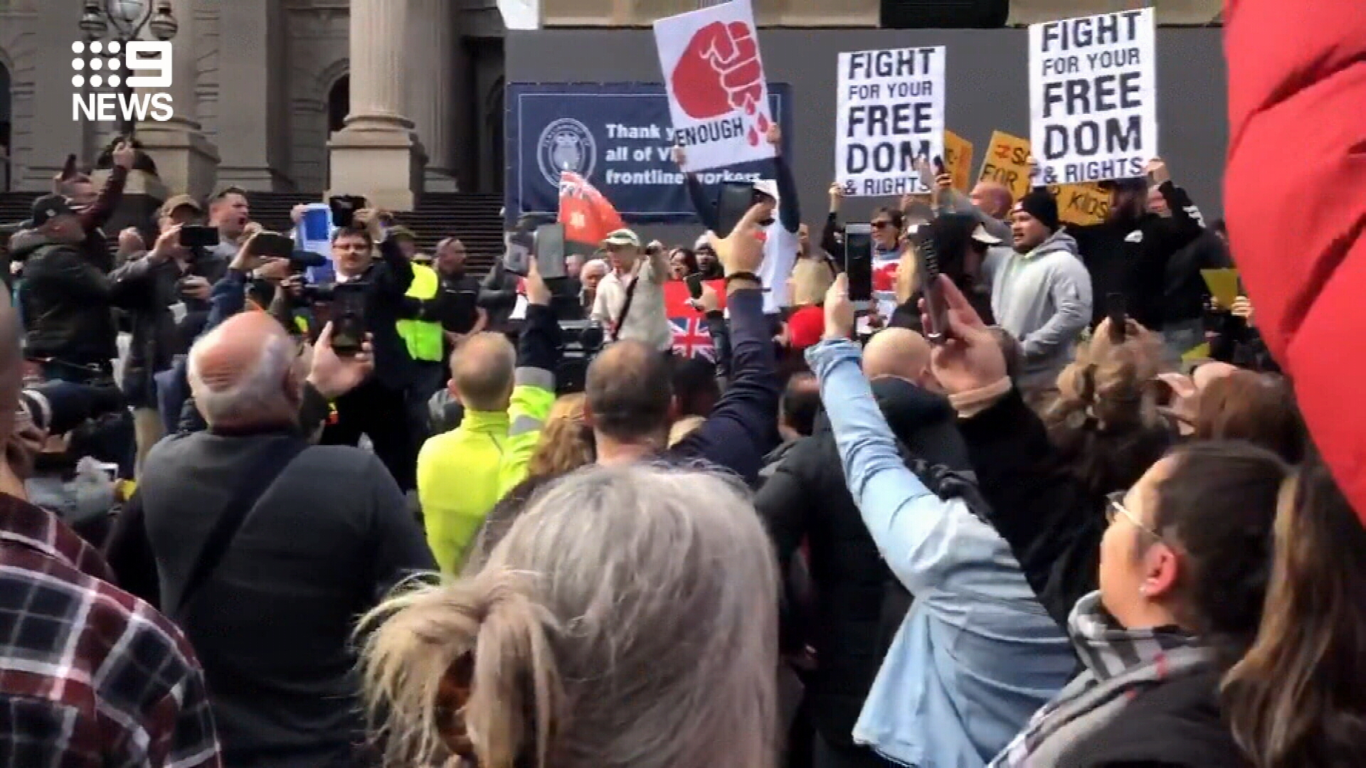 Dozens of people have stormed Parliament House in the city's CBD, holding signs and calling for lockdowns to end.