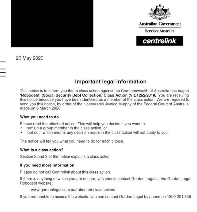 The Centrelink notices were sent via letter or MyGov to anyone it believed may be a member of the class action and included instructions on how to opt out of the lawsuit if they wished.
