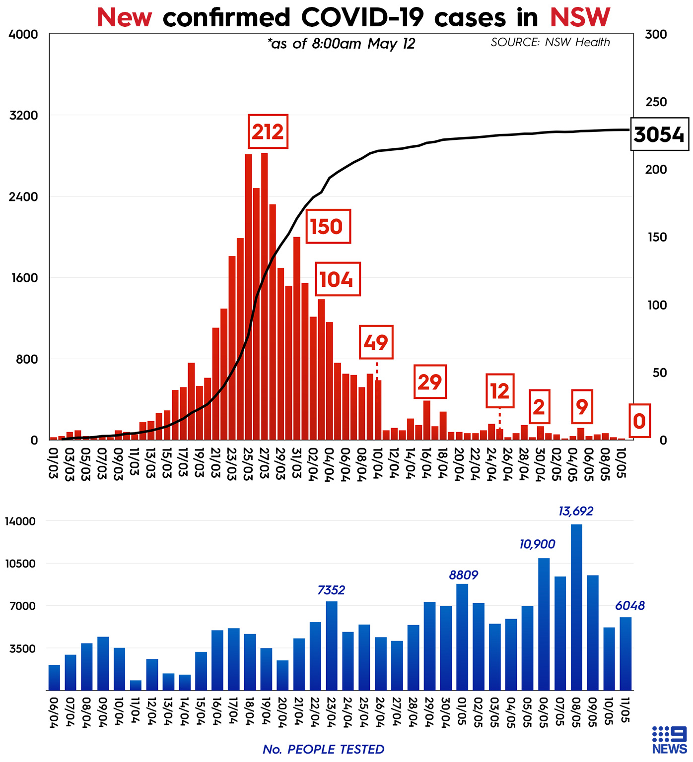 It's the first time there has been a zero-case day in NSW since the middle of February, weeks before the case numbers began to stack up dangerously.