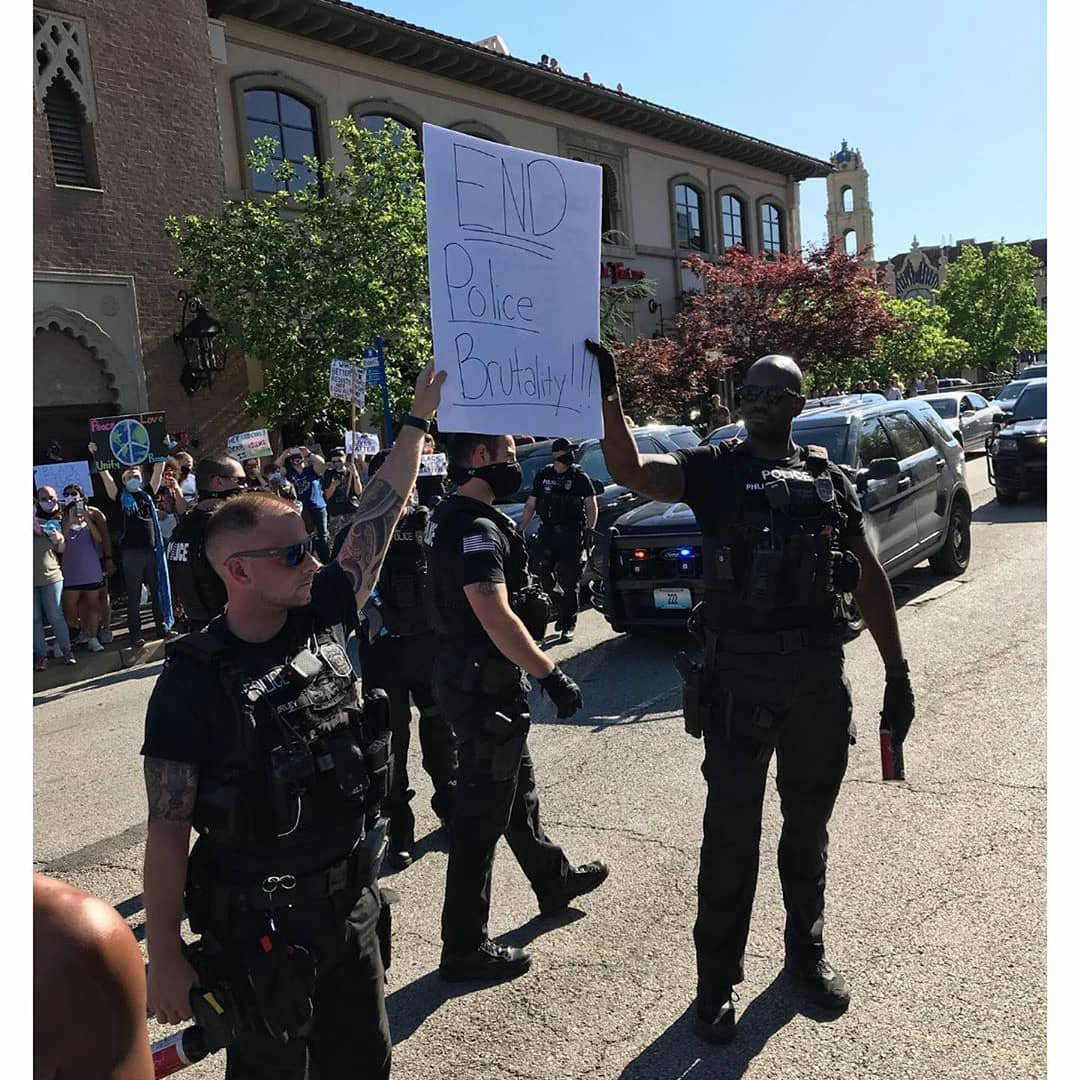 And in Kansas City, in Missouri, a white police officer was photographed standing next to his black colleague as they both held up a sign that read, 'end police brutality'.