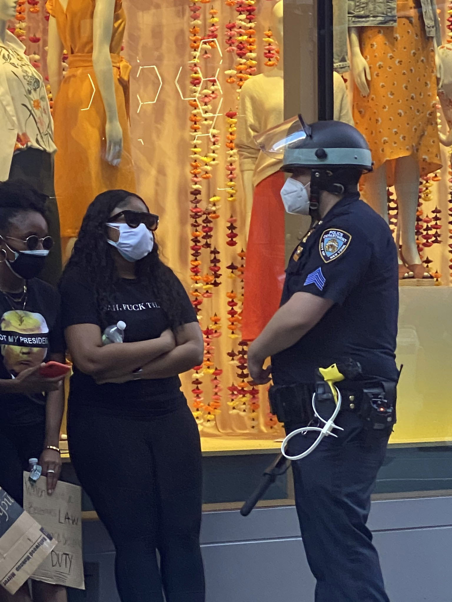 In New York City, a black woman was photographed standing with a white police officer as protests flared across Manhattan, Brooklyn and Queens.