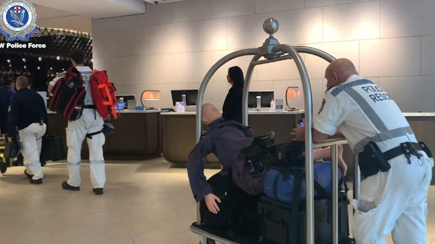 A dummy was seen being taken into the Hyatt Regency hotel by detectives, with investigators also abseiling down the side of the building as part of the probe.