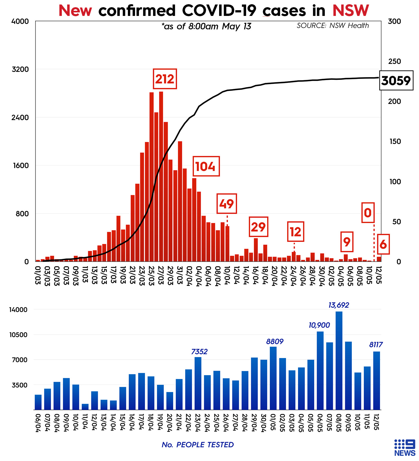 The total number of coronavirus cases in NSW is 3059, with 2571 people having recovered from the virus.