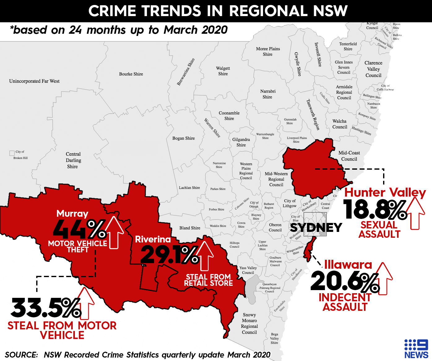 There was a large increase in theft in other parts of the state. In the Murray region, vehicle theft was up 44 per cent, while break and enters at homes increased by 9.3 per cent in the Central West.