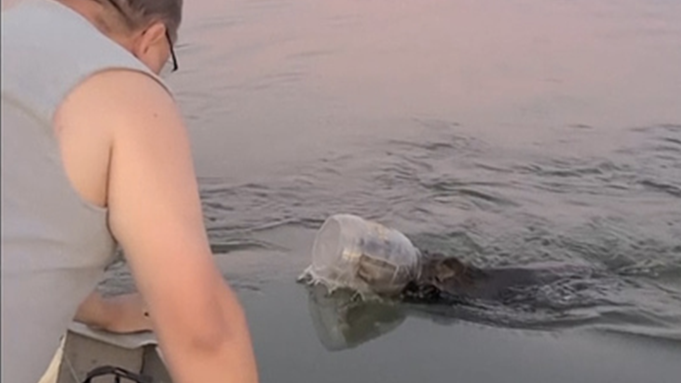 A family in the US helped save a young bear that was struggling to breathe while swimming in a lake with its head caught in a plastic food container.