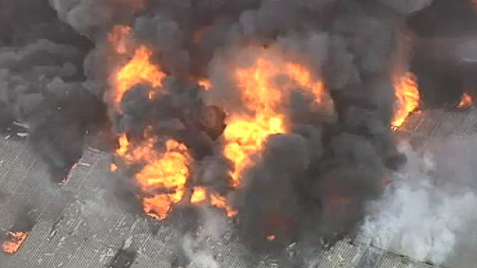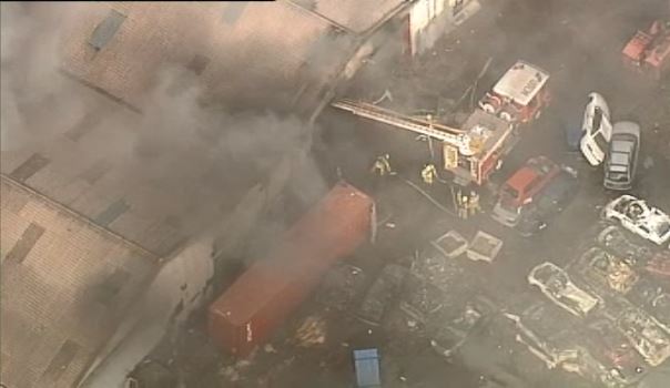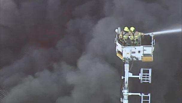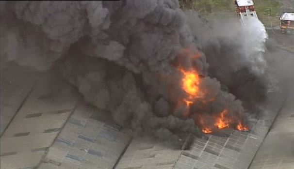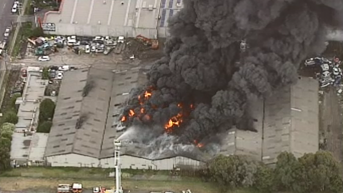 9News has captured aerial video of black smoke and flames billowing from the factory, as fire crews continue to battle the blaze.