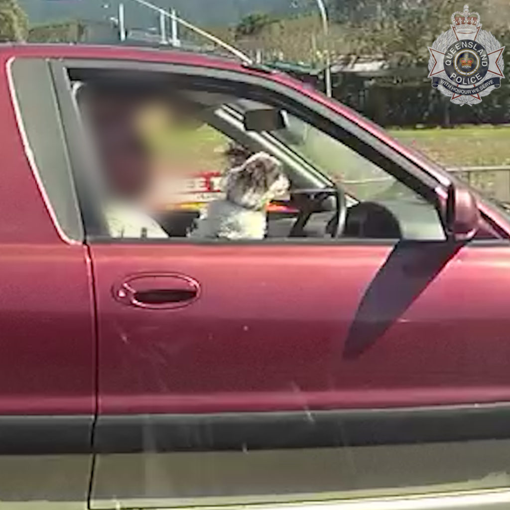 Police in Cairns pulled the red ute over recently after they filmed a dog taking in the view from the driver's seat on the Bruce Highway.