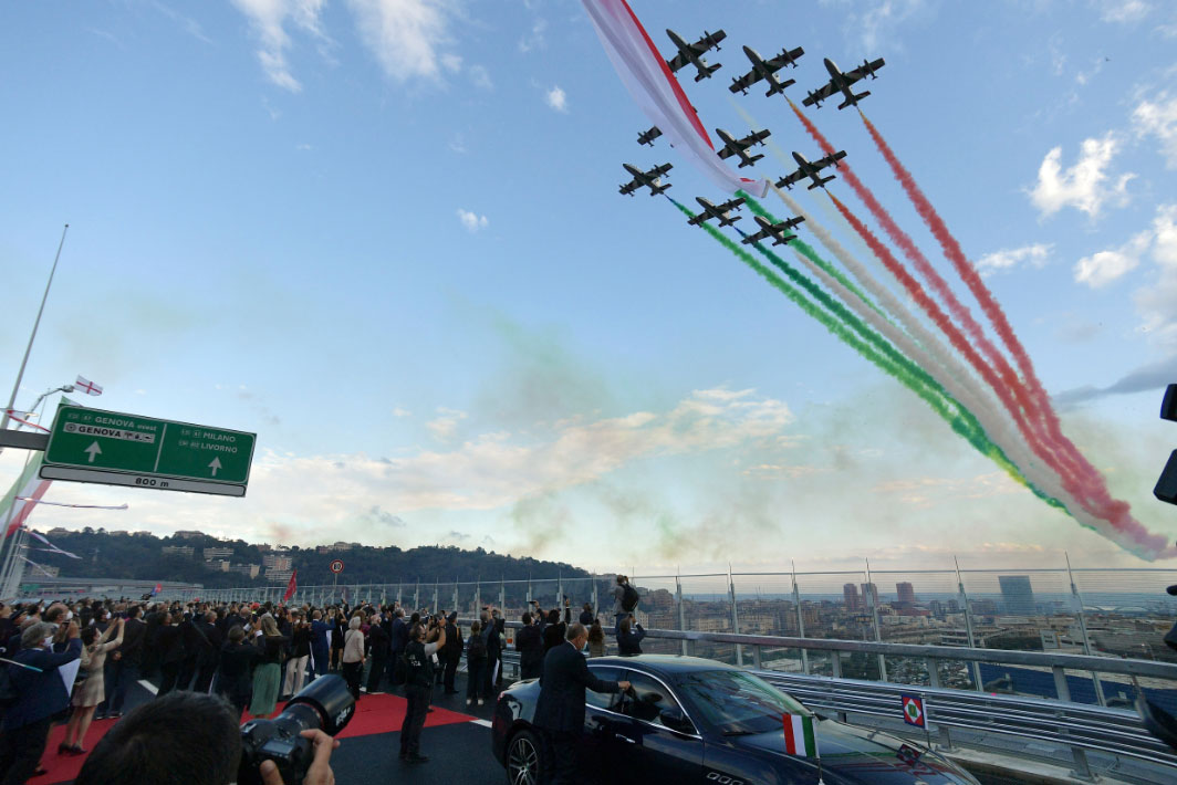Nine Italian air force jets flew in formation over the bridge, trailing smoke in the red, white and green colours of the country's flag.