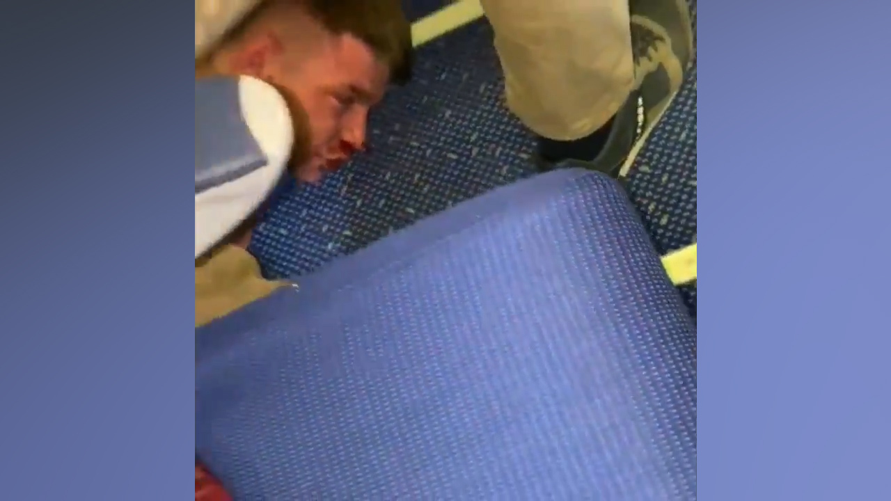 The men are finally restrained by passengers and staff, one seen pinned to the ground with hands held behind his back.