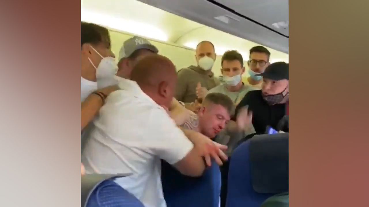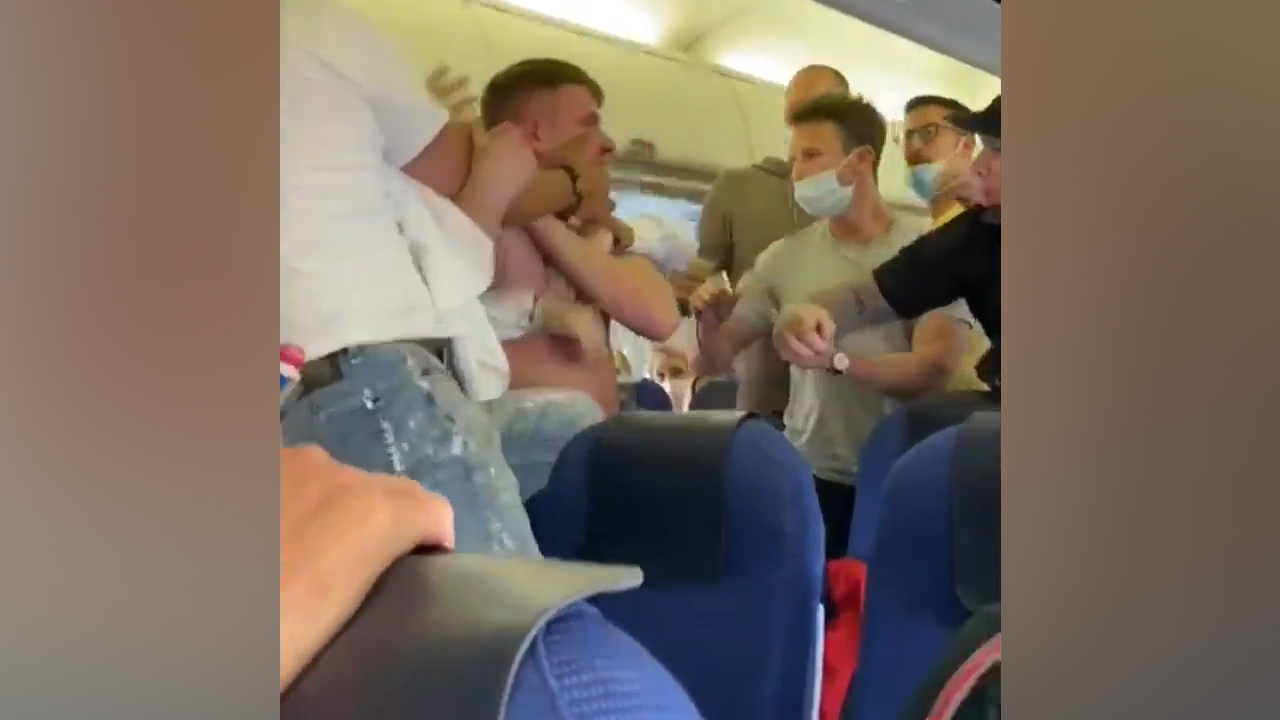 Video footage has shown the shocking moment a brawl broke out on board a flight from Amsterdam to Ibiza after two passengers refused to wear face masks.