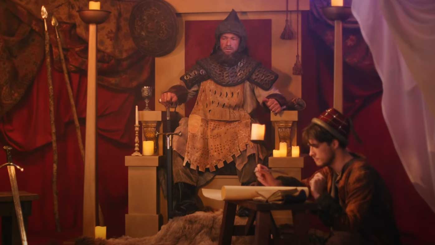 The ad features an actor depicting Attila the Hun barking out orders in an unintelligible grunt, to be translated by a scribe.