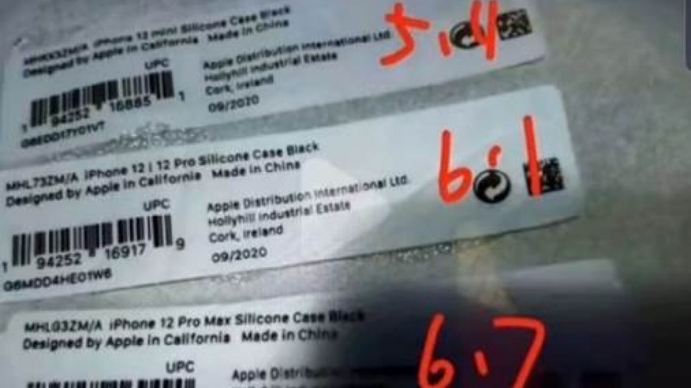 An image of packaging, alleged to be from the Apple distribution centre in Ireland, reveals three new phone case sizes, one for a 5.4" device, another for a 6.1" device and a larger case for a 6.7" device.