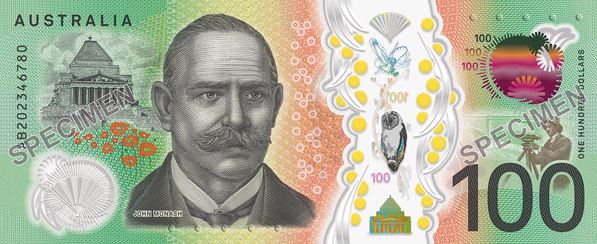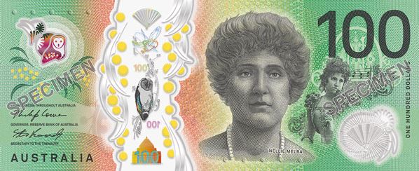 Some of the security features include a reversing "100" numeral within the Shrine of Remembrance symbol, a top-to-bottom clear window and a three-dimensional fan with colourful lines to commemorate Dame Nellie Melba's career.
