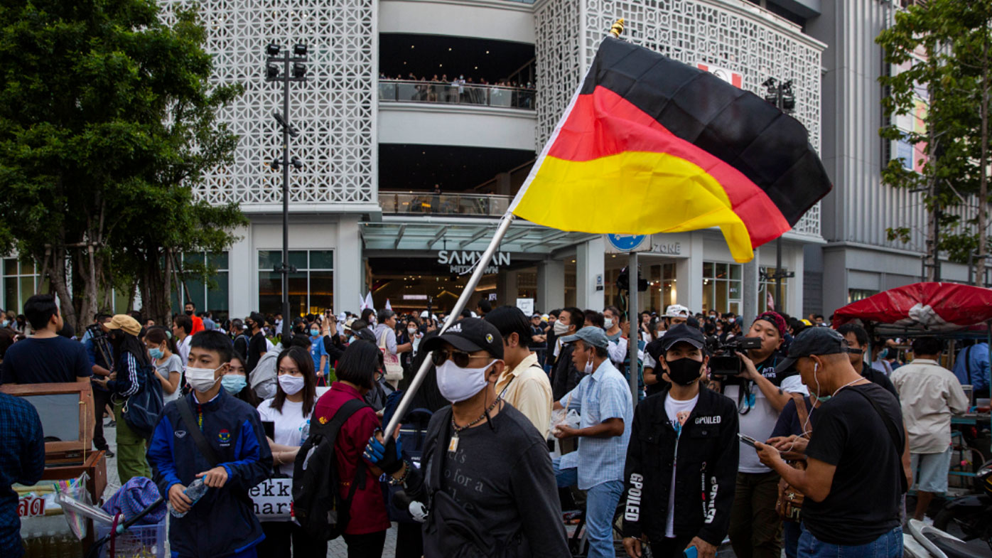 The protesters, estimated by an Associated Press journalist to number between 5000 and 10,000, defied police warnings that they constituted an illegal assembly and marched to the embassy in an effort to bring attention to the time King Maha Vajiralongkorn spends in Germany. The king in recent weeks has been in Thailand with a busy schedule of ceremonial events.