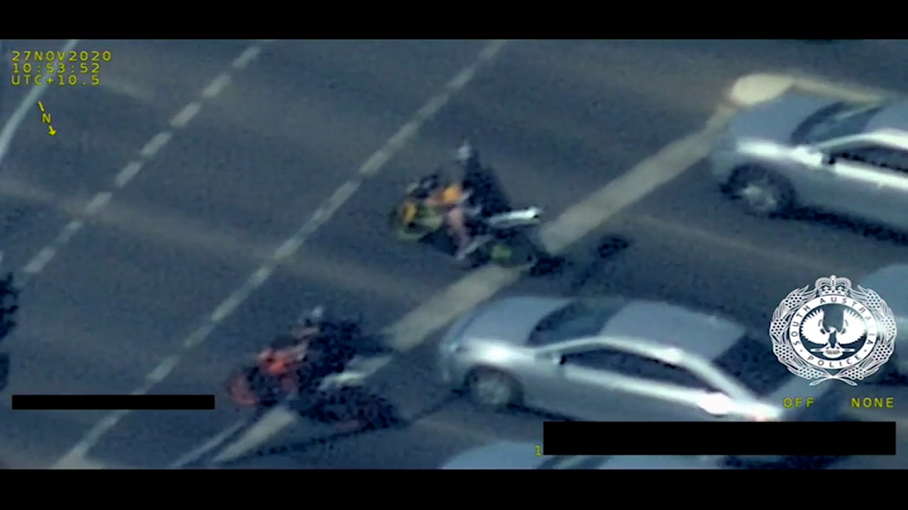 PolAir tracked the rider - who was just wearing shorts and a t-shirt - and caught him allegedly performing a "mono" at a speed of 140k/ph before he was stopped by ground patrols at Research Road, Pooraka.