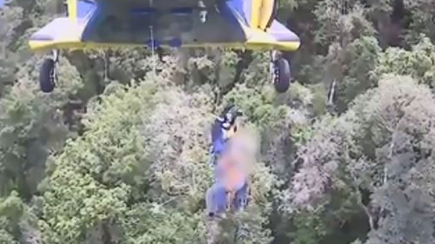 The 26-year-old man was winched to safety today, while a chainsaw was lowered to help clear the way for the injured man's rescue.