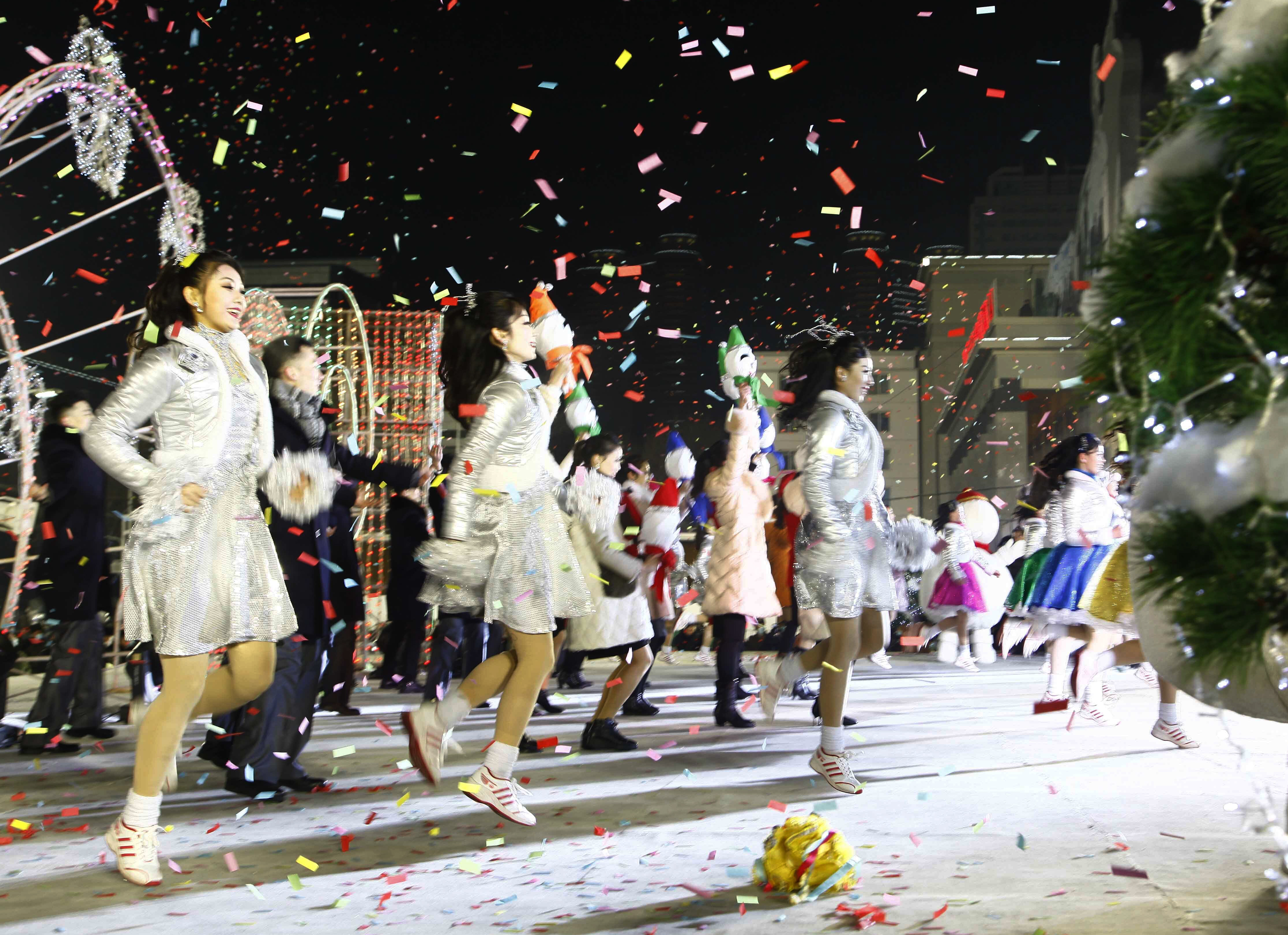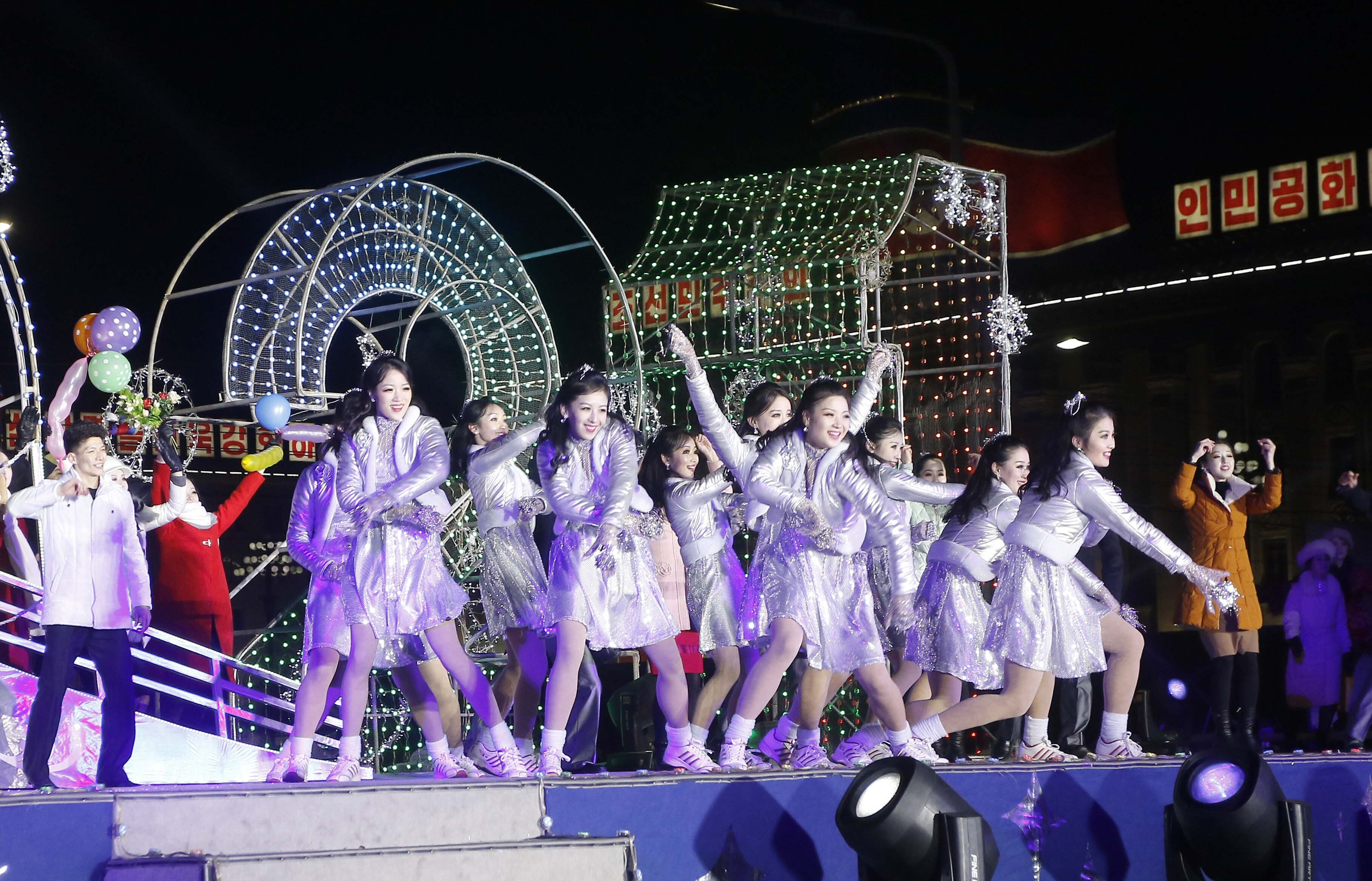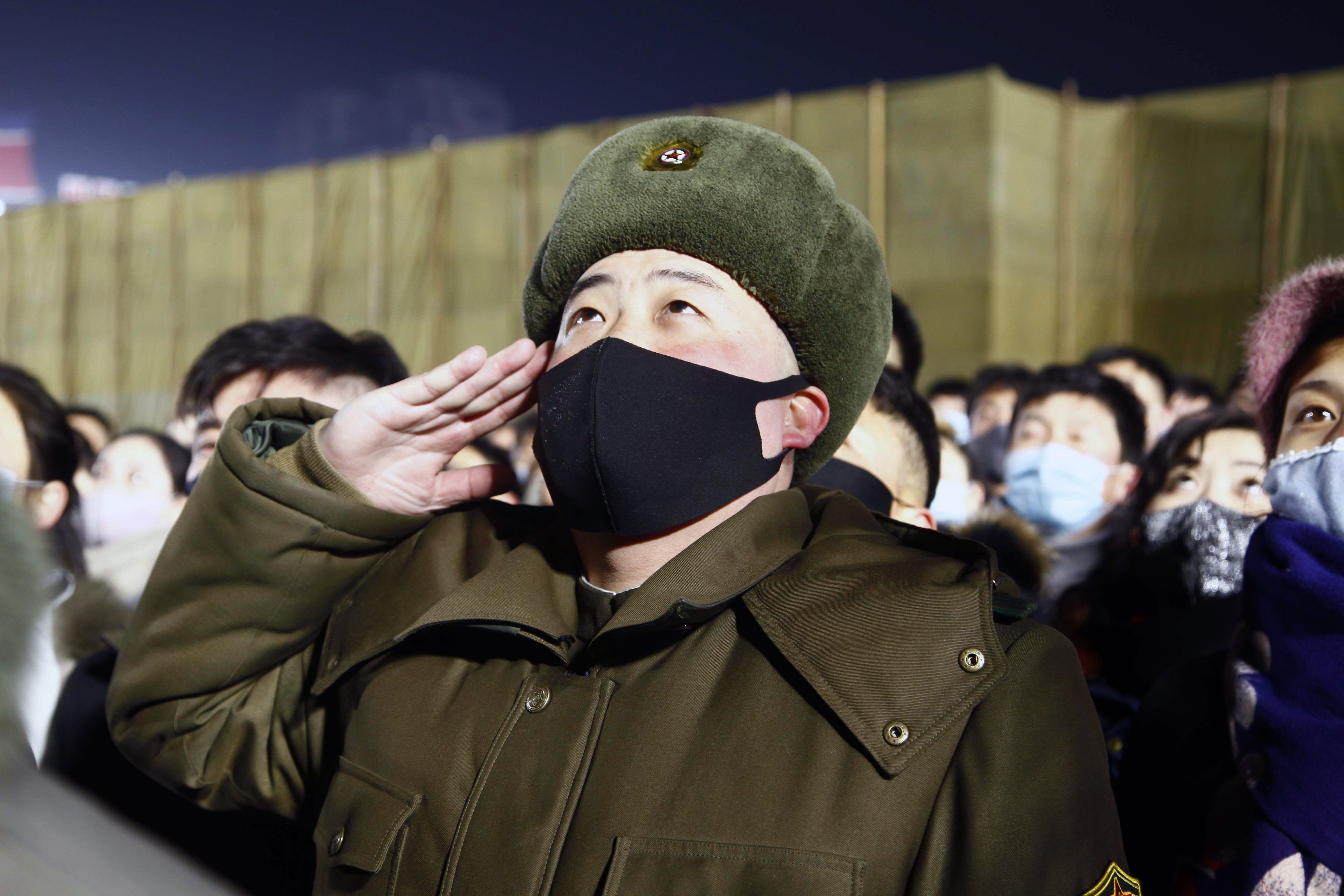 Ushering in the new year, a large crowd packed Pyongyang's main square to watch fireworks, a concert and a flag-hoisting ceremony. State TV showed people wearing masks and heavy coats, waving and standing close together.
