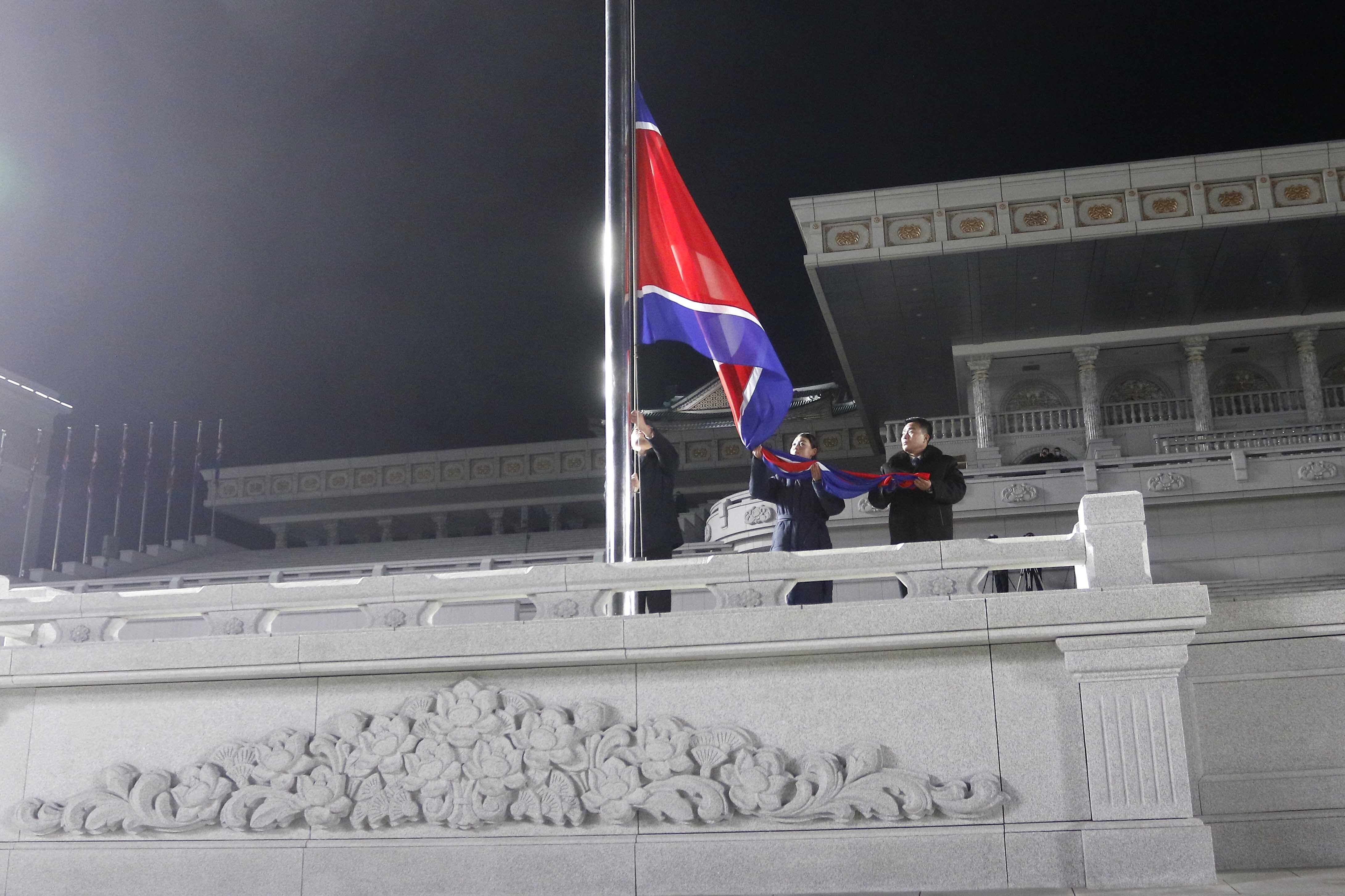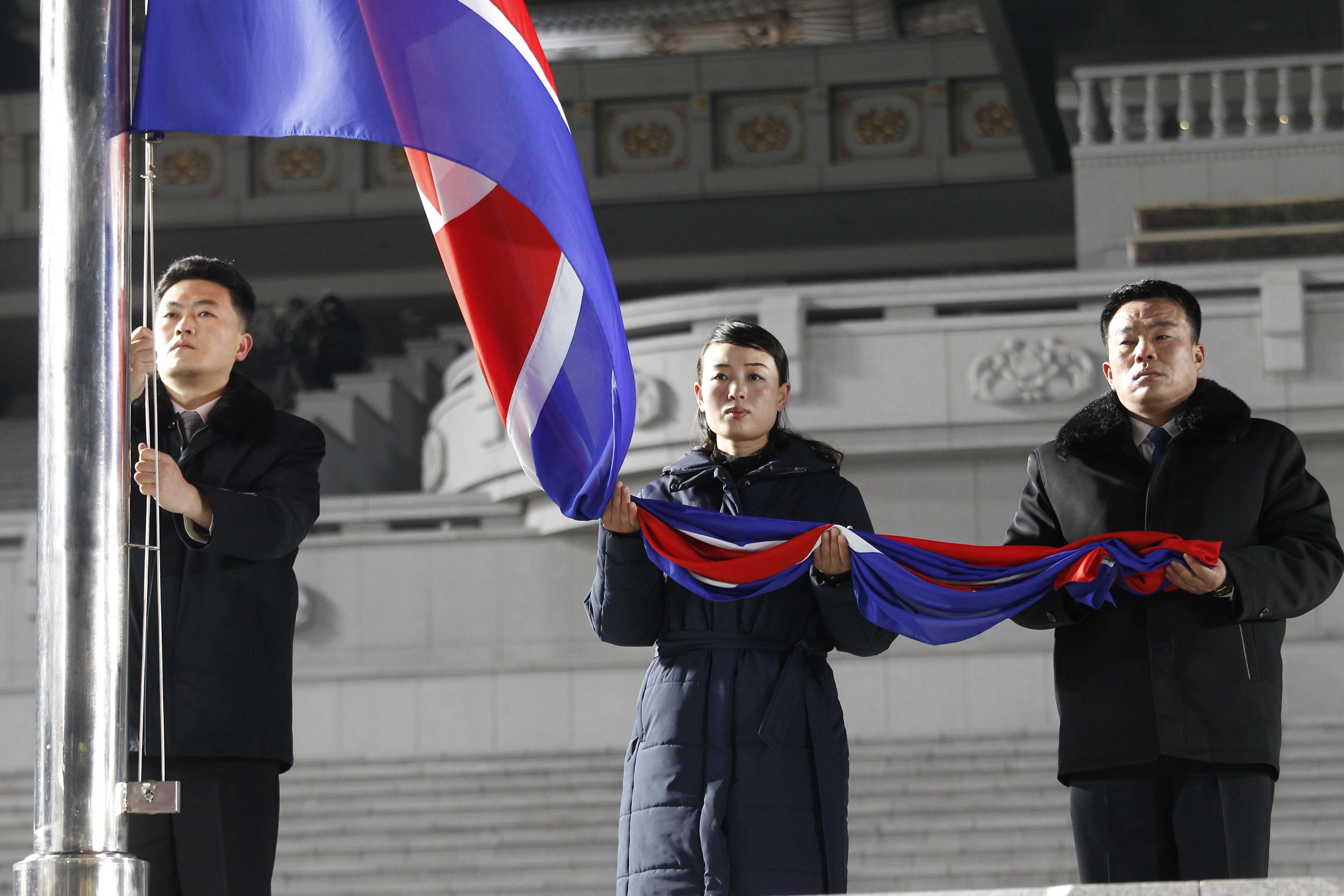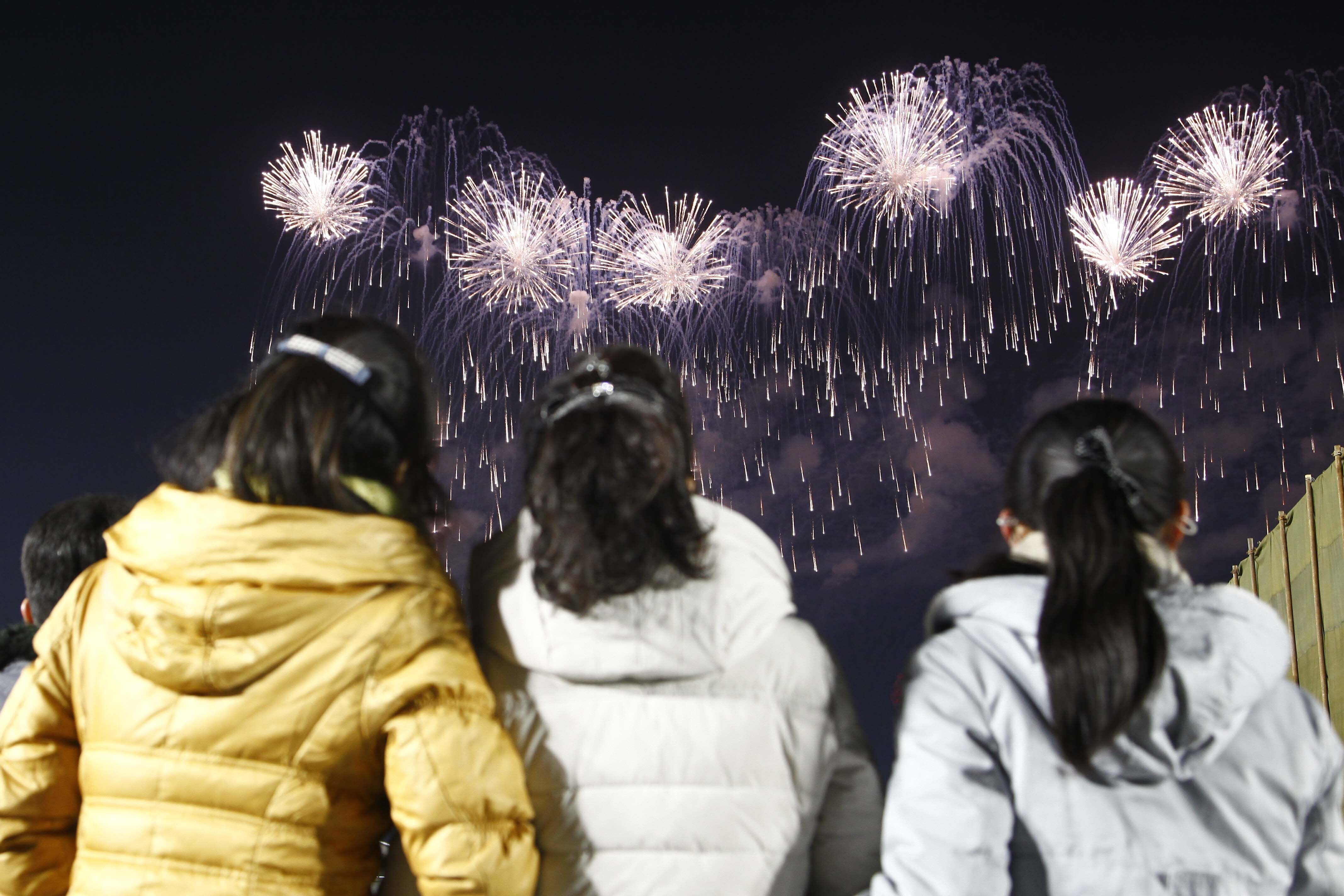 Ushering in the new year, a large crowd packed Pyongyang's main square to watch fireworks, a concert and a flag-hoisting ceremony. State TV showed people wearing masks and heavy coats, waving and standing close together.