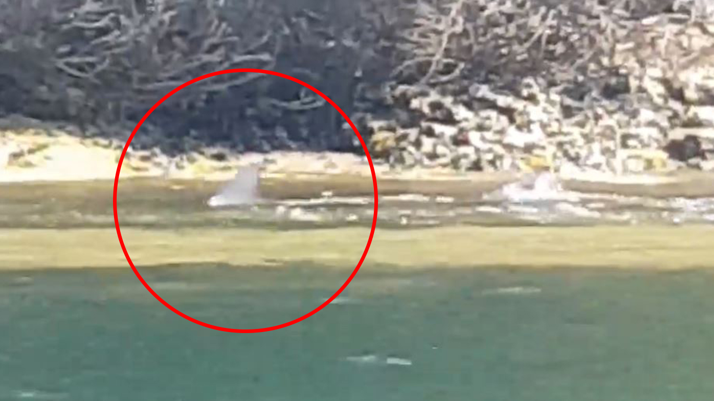 In a video taken by Mr English about 2pm on the Port Hacking River near Warumbul, the shark swims along the water's edge and splashes as it chases prey.