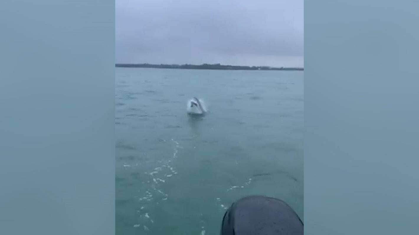 The four-metre great white began chasing the fish three metres away from the boat near Anzac Bay at Bowentown.