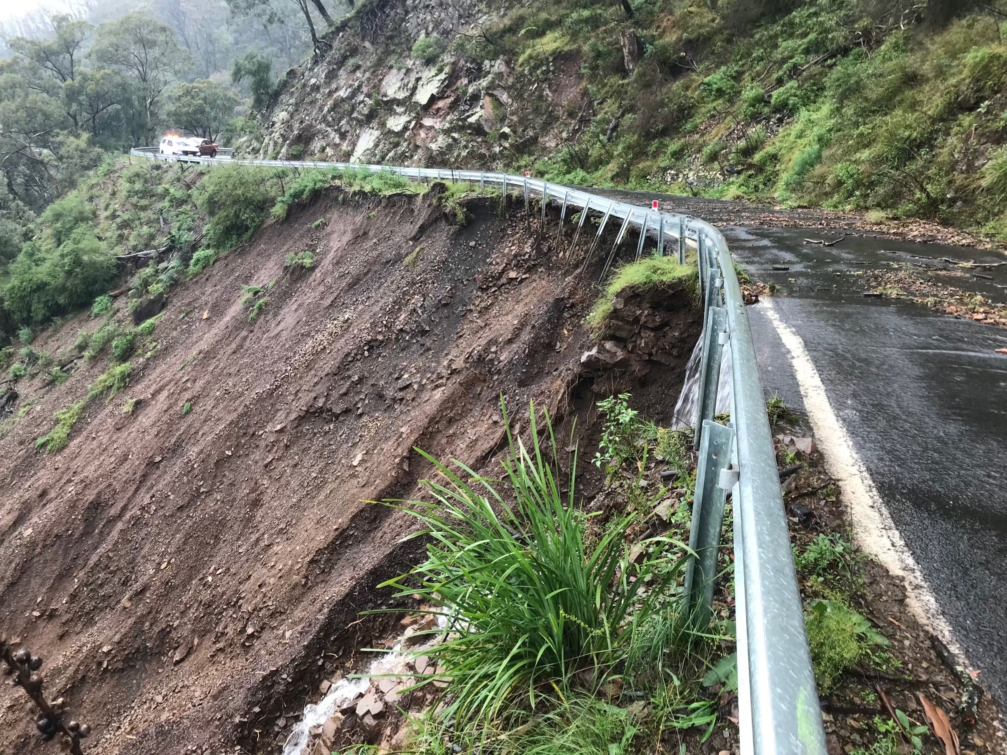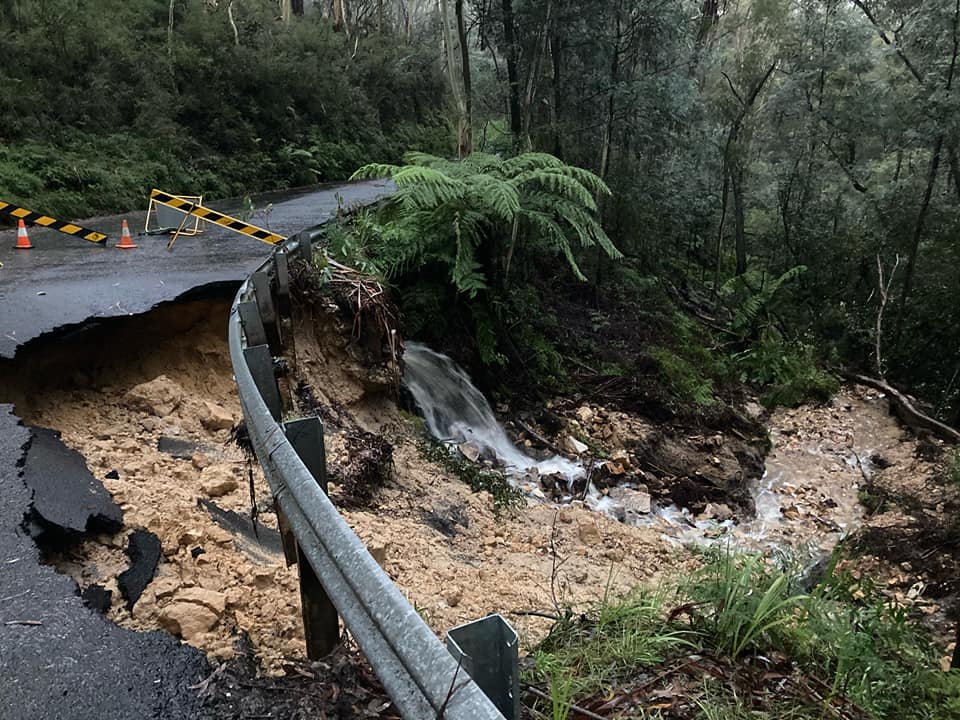 The Bells Line of Road was cut at Mount Tomah in the Blue Mountains National Park this morning due to large landslips following days of heavy rain.