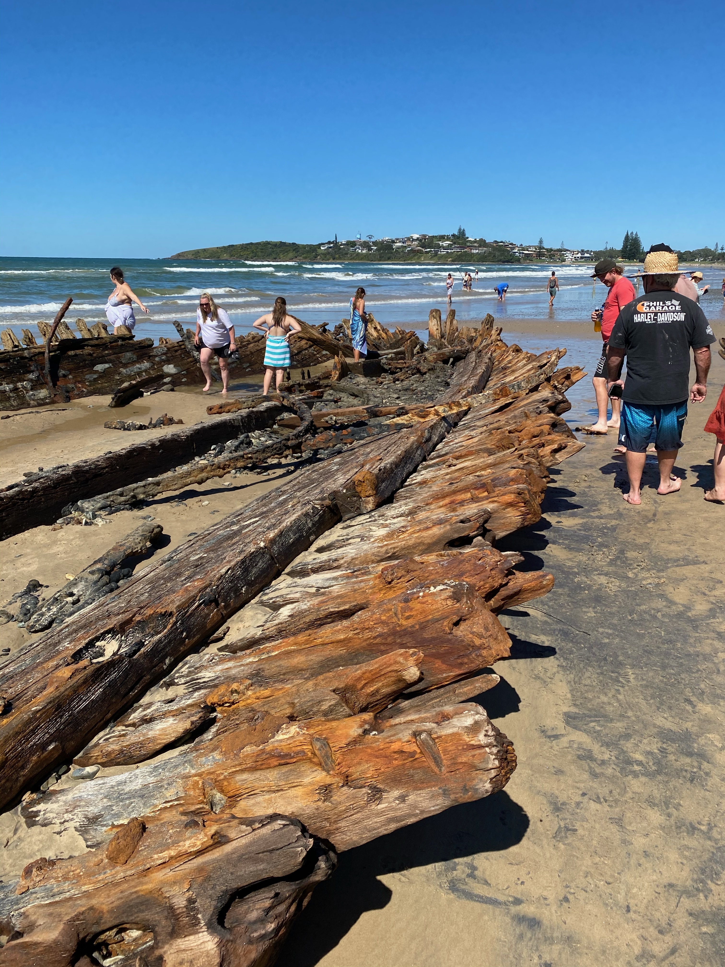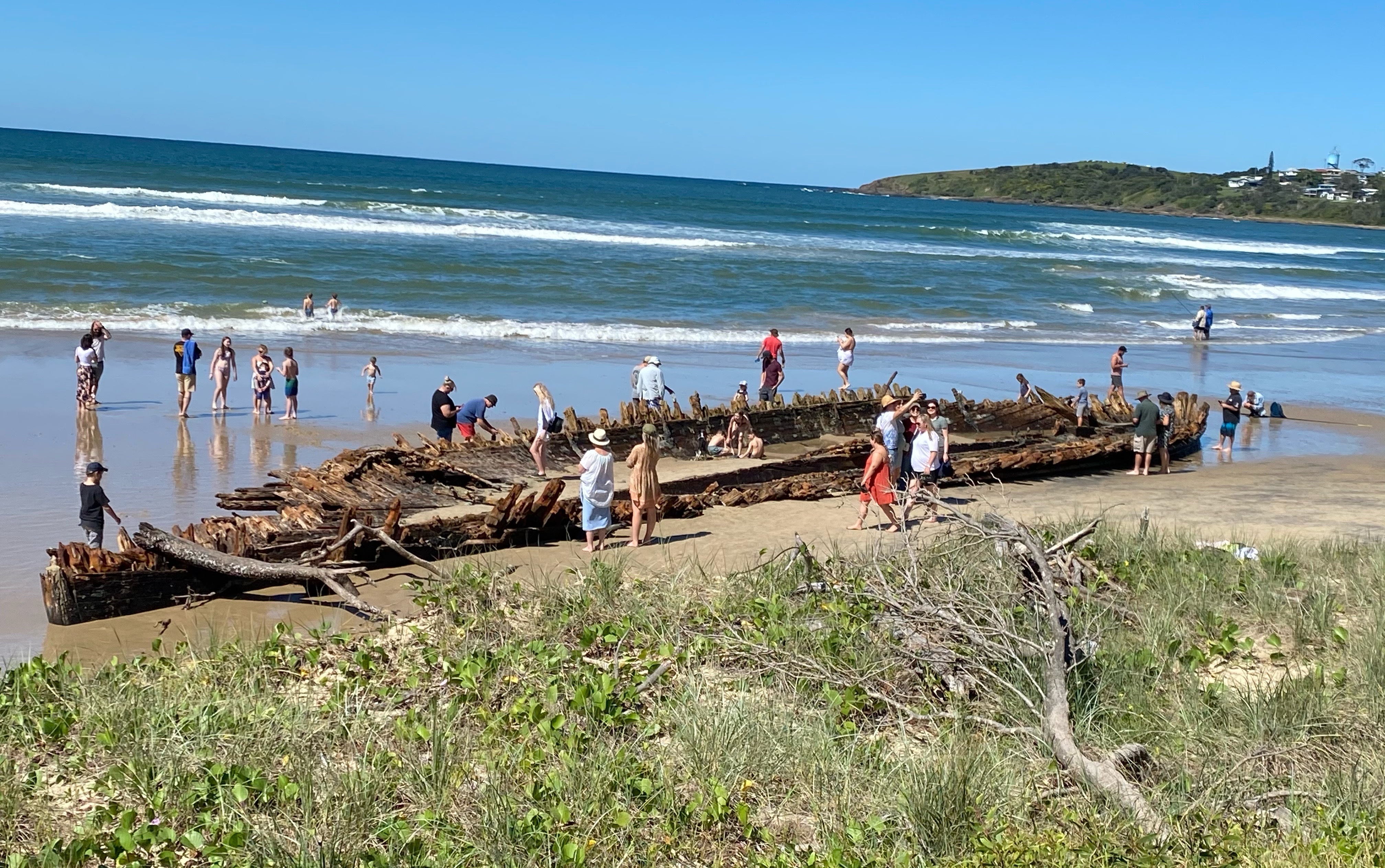 The 39-metre vessel, named Buster, is fully visible for the first time in years after wind and heavy seas washed away the sand on Woolgoolga Beach, north of Coffs Harbour.