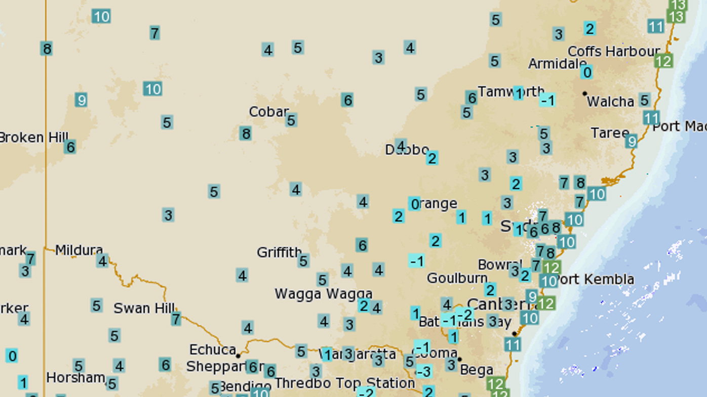 Sydney dropped into single digits, recording 9.6 degrees, while Canberra plunged below zero, with the mercury sitting at -2.6 degrees.