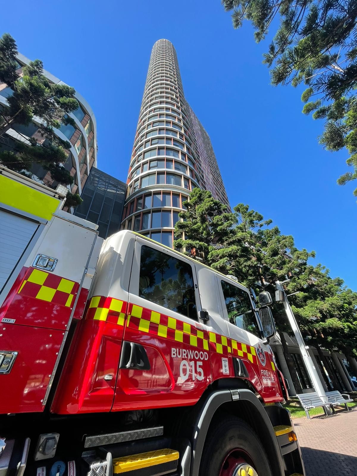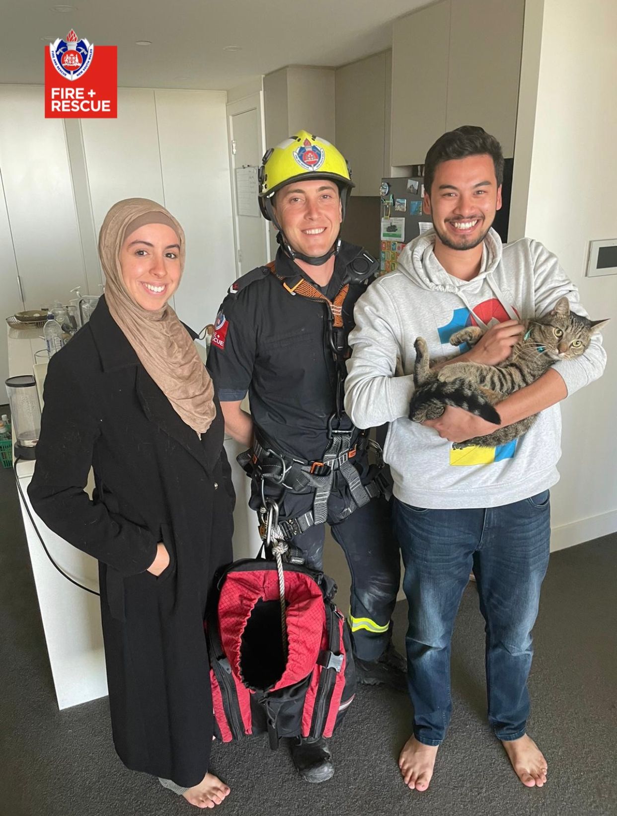 Fire crews were forced to go to great heights to rescue a cat stranded on the outside of a high-rise building in Sydney's west yesterday.