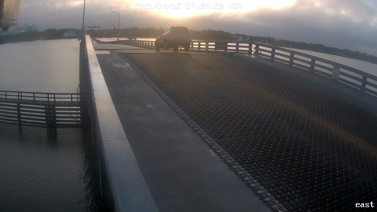 A Florida driver has been recorded smashing through lowered traffic arms before jumping a rising drawbridge at speed.