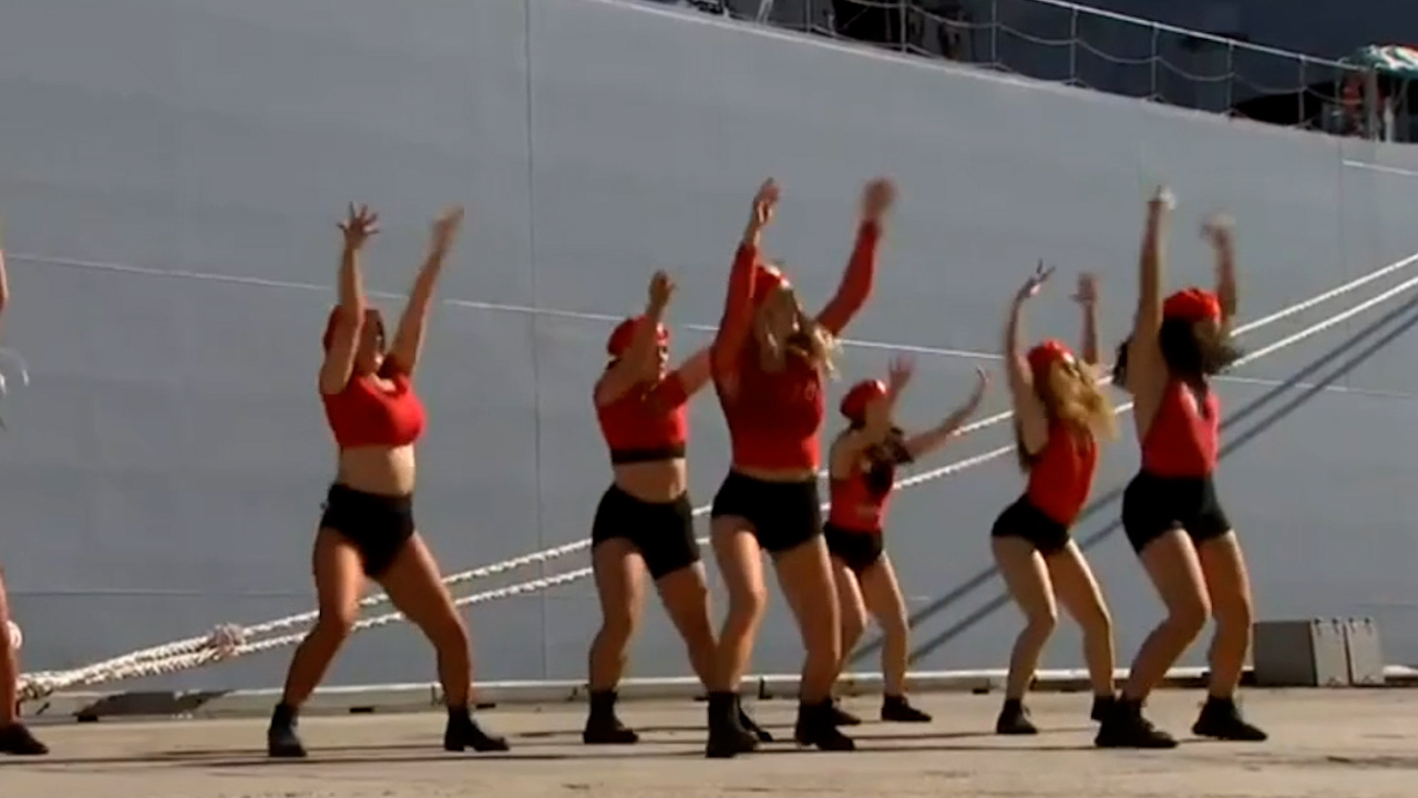 The twerking dancers performed a routine for several minutes ahead of the official commissioning ceremony for the $2 billion naval vessel HMAS Supply on the weekend.