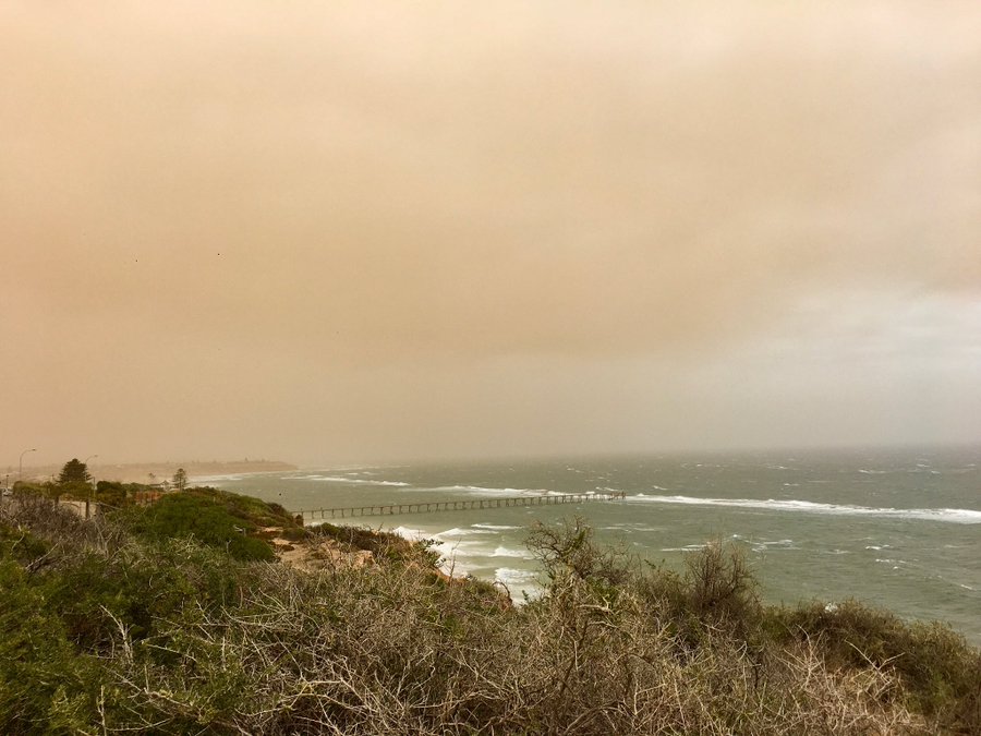 Visibility around Glenelg has been poor for most of the day with the orange skies stretching to Port Noarlunga and the Hills.
