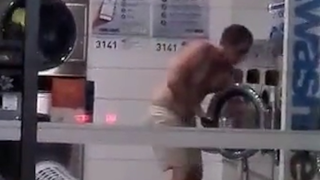 Bizarre video has emerged of a man taking his clothes and shoes off and throwing them in and out of a washing machine over and over at a Gold Coast laundromat.