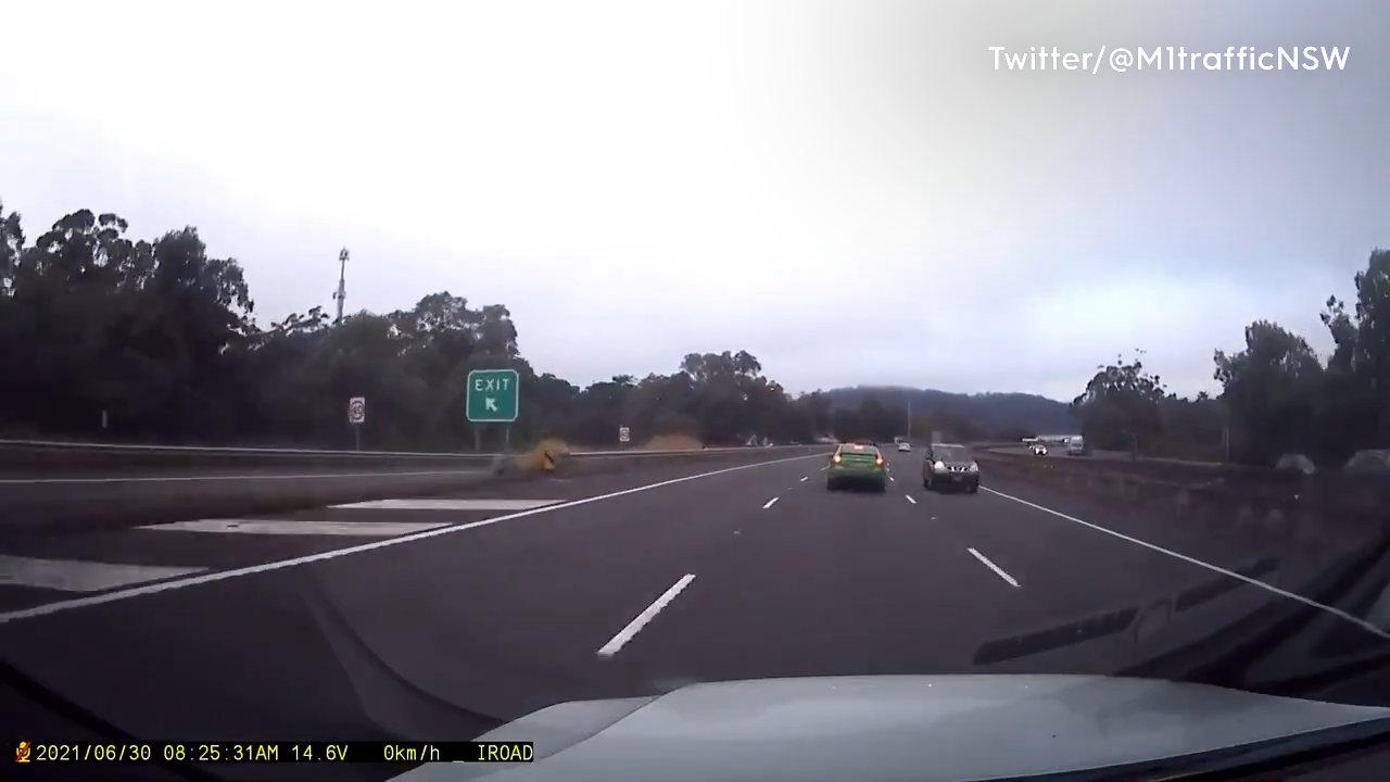 Posted on the M1 Pacific Motorway NSW traffic monitoring account on Twitter, the video shows the cars ahead brake and rapidly shift lanes as the Nissan 4WD surges ahead with its headlights on.