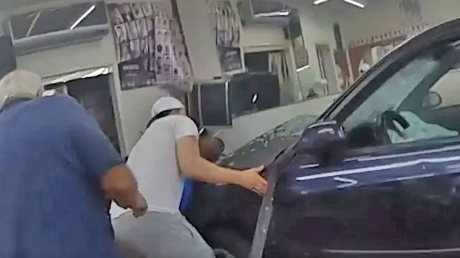 The frantic incident happened when a 43-year-old driver, David Poncurak, allegedly crashed into a car before careening across the road and into the storefront of a local barber shop in the town of Yonkers on Friday.
