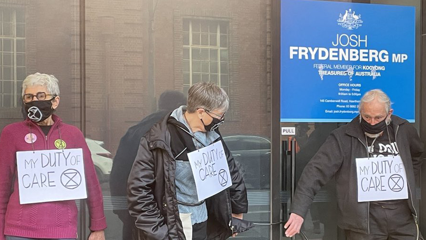 Extinction Rebellion activists have locked themselves to the door of Federal Treasurer Josh Frydenberg's Melbourne office and super-glued themselves to the windows, saying they refuse to leave until their demands are met.