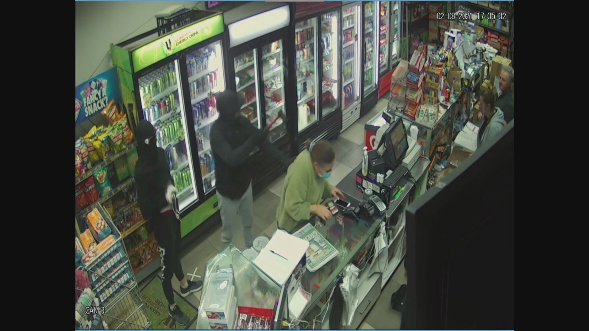 The pair were caught by security cameras storming into the Whalan convenience store and demanding cash just before 5.30pm yesterday afternoon.