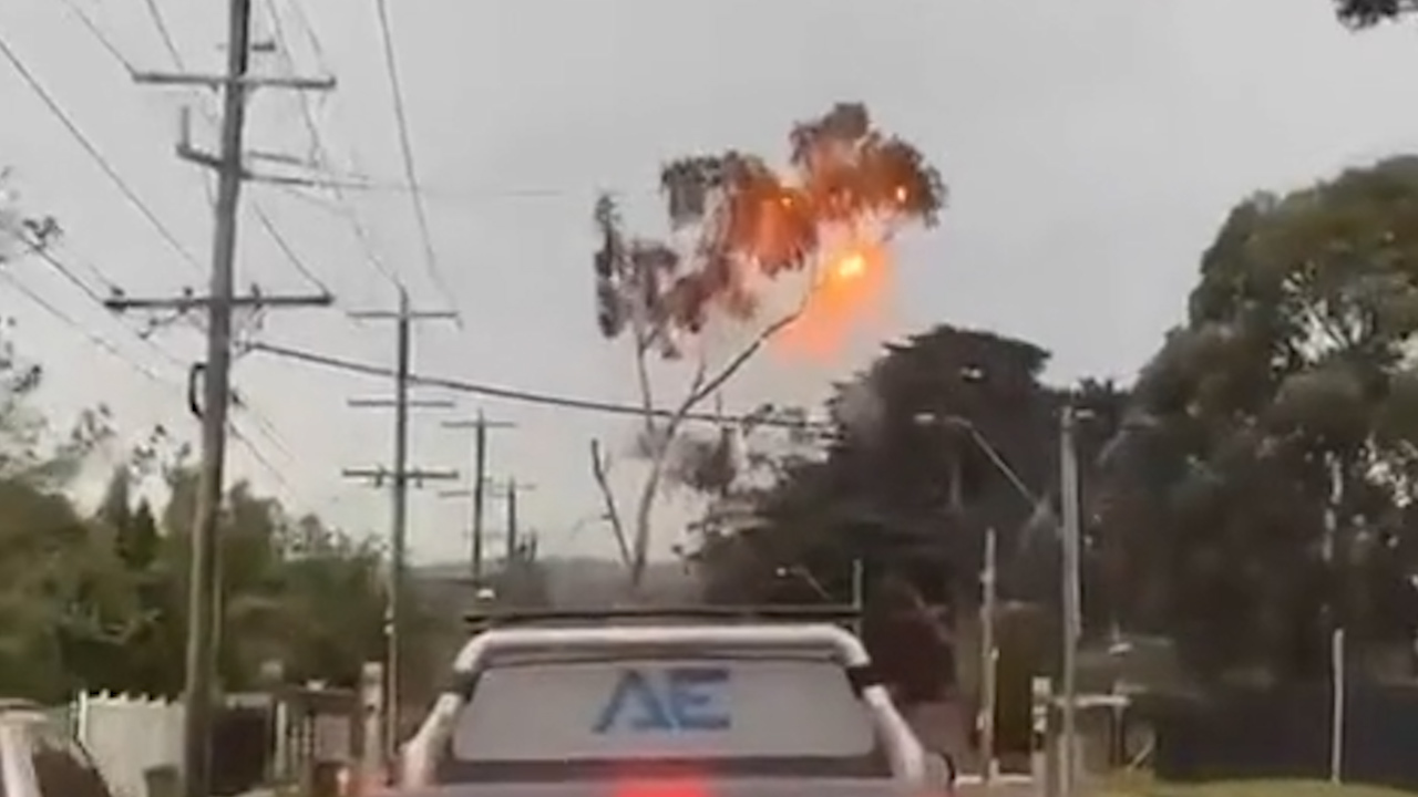 The moment a live powerline hit a tree, causing a firey explosion in Melbourne has been caught on camera.