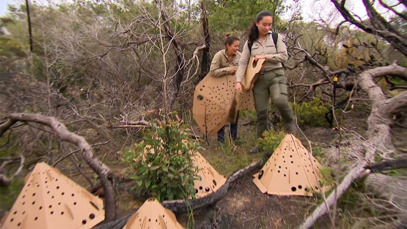"We're trialling these as temporary refuges for the ground-dwelling animals, so they have somewhere to hide," Australian Wildlife Conservancy Wildlife Ecologist Viyanna Leo said.