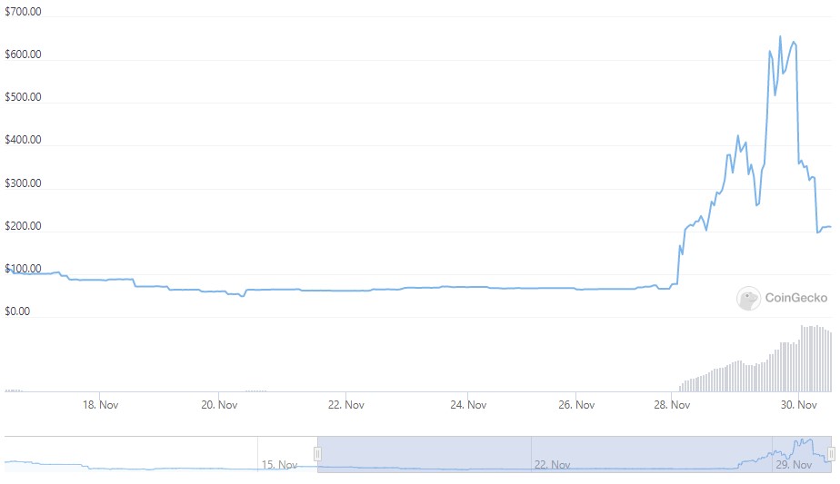 The price of the hitherto-obscure digital token, whose Twitter feed has little more than 1000 followers, rose almost ten-fold from Friday to Monday morning when it hit US$688, before tumbling as much as 75 per cent, crypto tracker CoinGecko said.