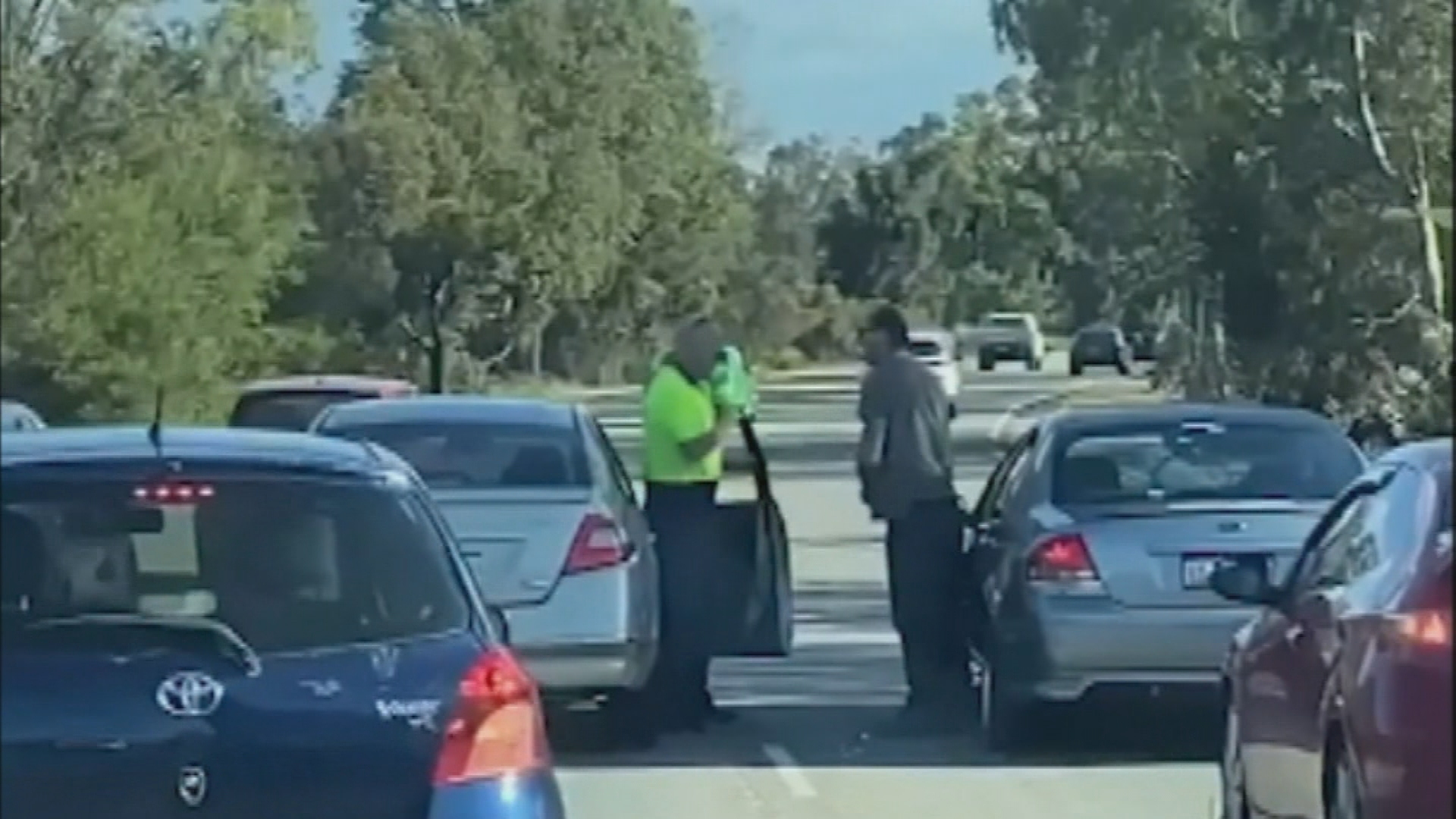 Dashcam video of the incident on the Tonkin Highway at Wattle Grove shows punches being exchanged by two drivers.