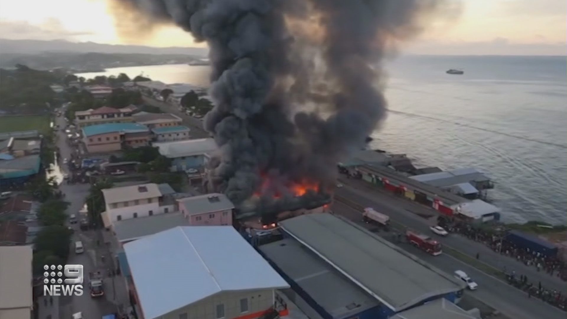 Australian police have touched down in the Solomon Islands amid calls for calm and demands for the Prime Minister to resign after protests rocked the capital of Honiara for the second day in a row, leaving fires raging and smoke billowing above the city.