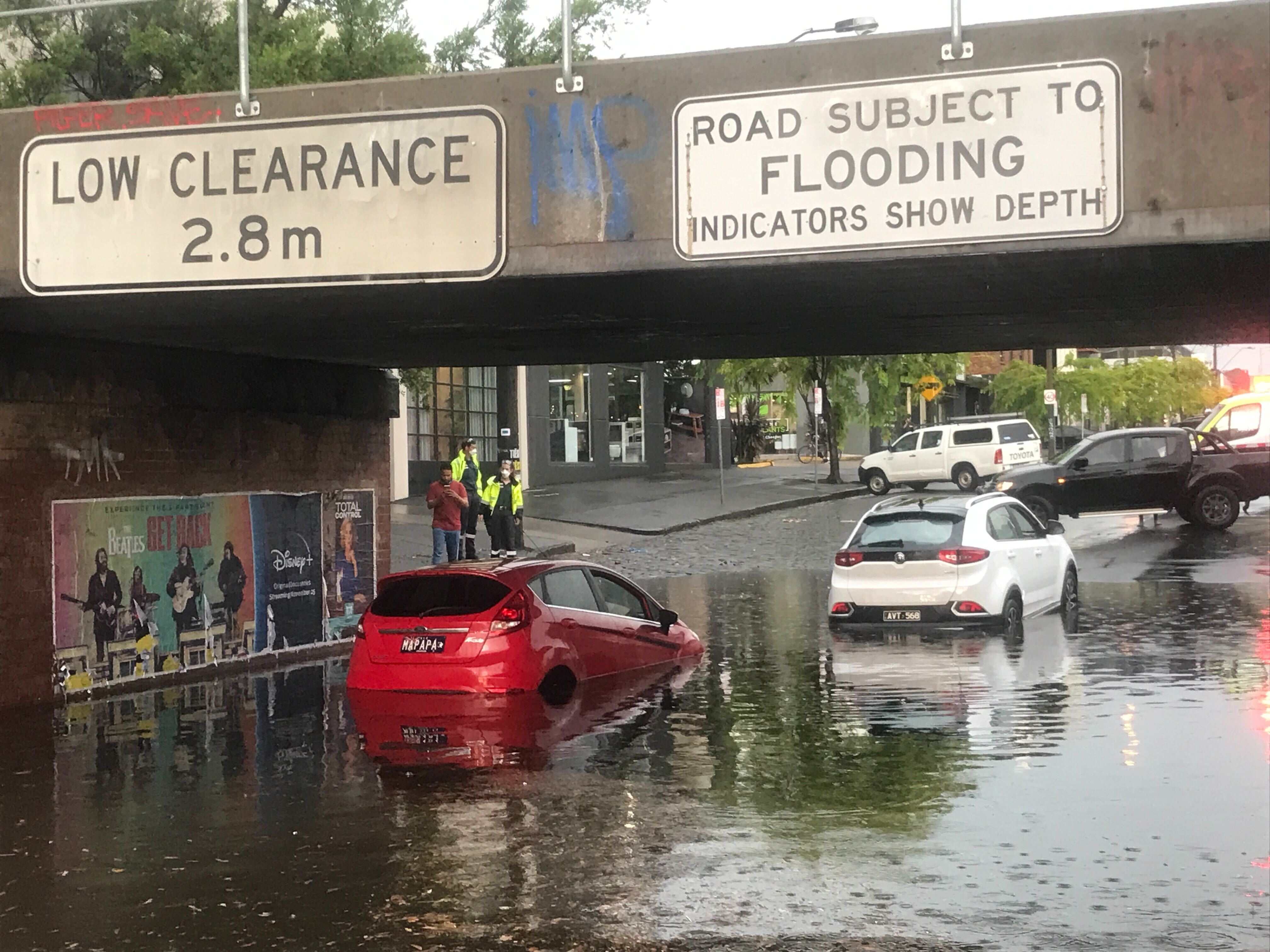 Firefighters have had to help remove two cars trapped in deep water on York Street in South Melbourne.